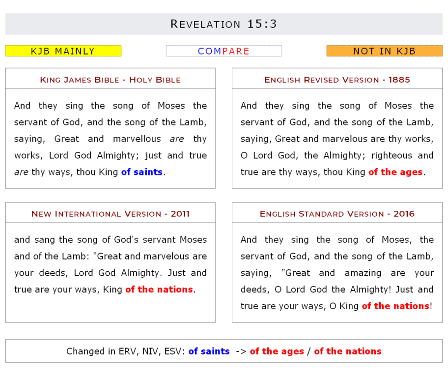 Changed in ERV, NIV, ESV: of saints -> of the ages / of the nations