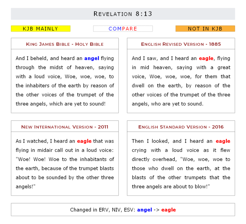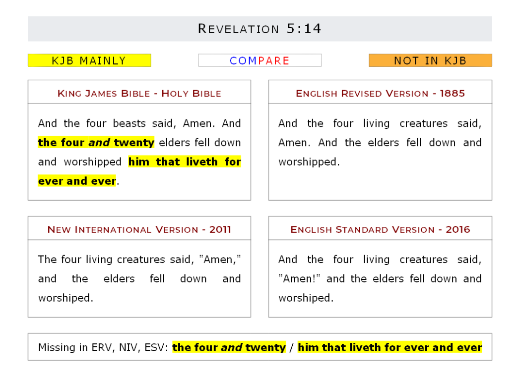 Missing in ERV, NIV, ESV: the four and twenty / him that liveth for ever and ever